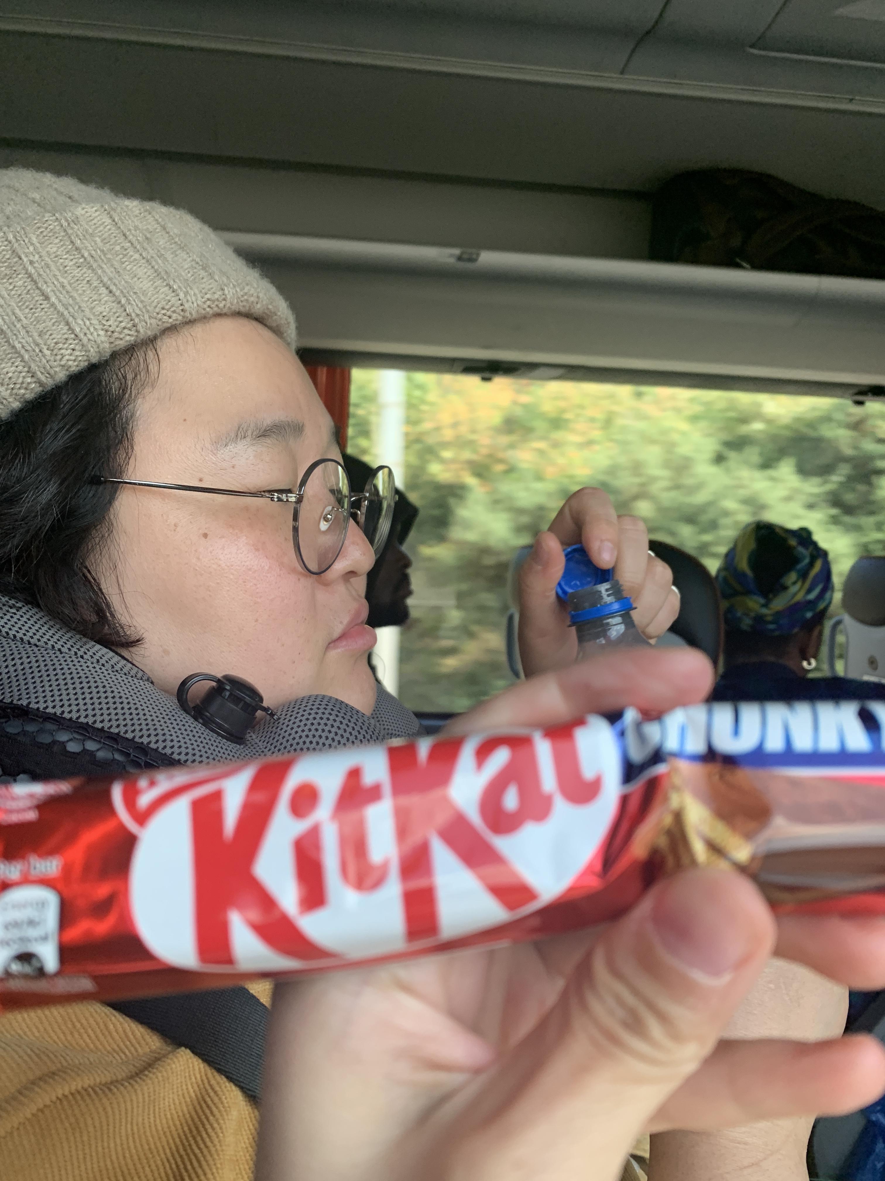 30분 정도 시간이 있어 KFC에서 늦은 점심을 먹었다. 샐러드, 햄버거, 치킨을 시켜 먹었는데 휴게소 음식 퀄이 이 정도면 이거 한국에 오면 소떡소떡 뺨치겠군. 아라에게 2파운드 빌려서 산 콘샐러드도 맛있었다. 20분까지 버스에 타야 해서 막판에는 거의 들이붓고 다시 버스에 올라탔다. 폰 충전기 때문에 은정언니랑 자리를 바꿨는데, 뒷자리 꼬마..^^ 소리 지르고 싶으면 지르고, 웃고 싶으면 웃고, 노래도 부르고… 정말 자유로운 꼬맹이가 딱 걸렸다. 꼬마 덕분에 눈이 마주친 우리는 못 알아들을 한국말로 진짜 부럽다며 웃었다. 나도 지루하면 내리고 싶다고 소리 지르고 싶다‼️